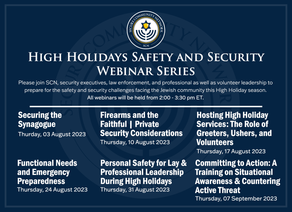 Please join SCN, security executives, law enforcement, and professional as well as volunteer leadership to prepare for the safety and security challenges facing the Jewish community this High Holiday season.